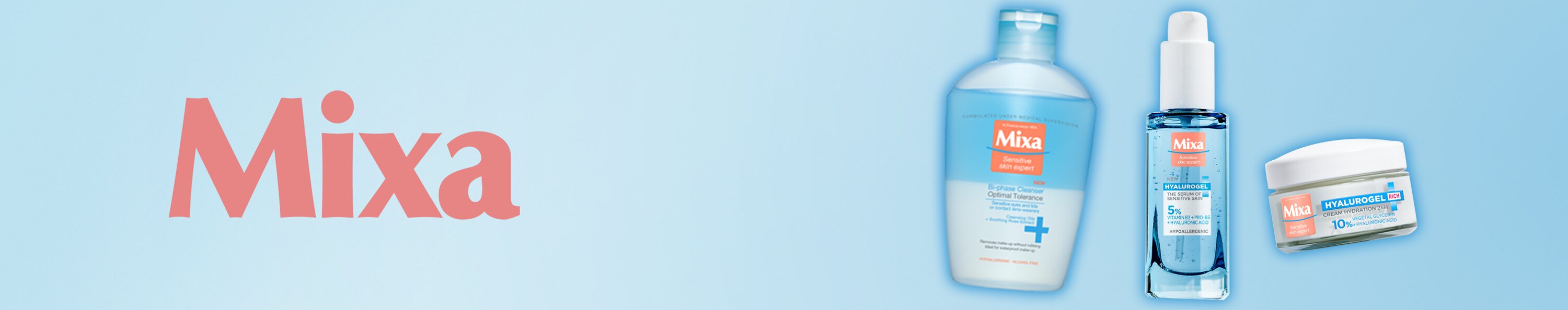 Kozmetika Mixa kreirana je pod liječničkim nadzorom i sadrži najkvalitetnije aktivne sastojke , kao što su pro-retinol, bademovo ulje, zobeno mlijeko i vitamine. Jedinstvena mješavina ulja i voskova, poznata kao krema za hlađenje , umiruje kožu. Proizvodi ne sadrže neželjene sastojke koji iritiraju kožu, poput parabena, alkohola ili bojila, stoga je Mixa kozmetika prikladna za osjetljivu kožu i hipoalergena je. Unatoč svojoj nježnosti, Mixa proizvodi su maksimalno učinkoviti i pružaju koži sve što joj treba da bude čista, meka i nahranjena .