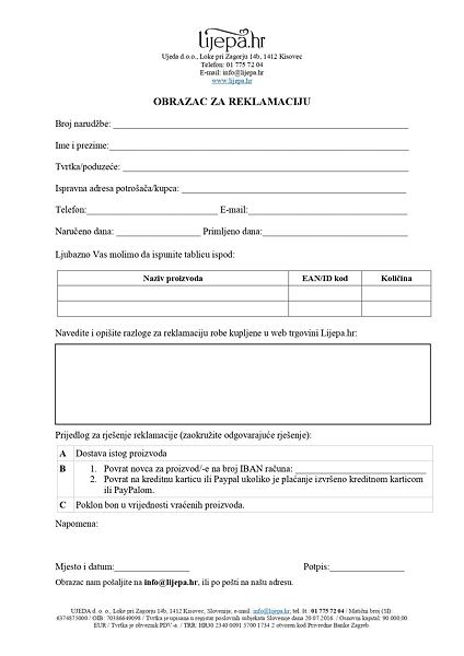 U slučaju gubitka pošiljke ili da je pošiljka koju ste preuzeli oštećena, nećete morati čekati do isteka zakonskog roka da bi se vaša situacija riješila već će ista biti riješena odmah. Sve što trebate učiniti je poslati nam fotografije i drugu dokumentaciju o oštećenju na naš e-mail (info@lijepa.hr), a mi ćemo vam odmah poslati nove proizvode ili urediti povrat novca za već plaćene proizvode.